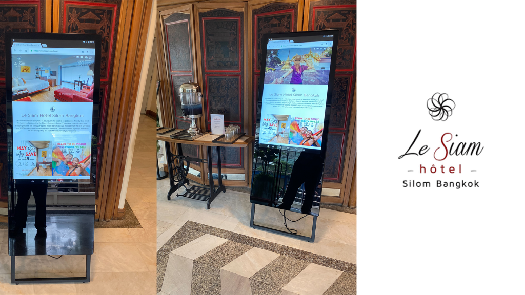 งานติดตั้งจอ Digital Signage Kiosk แบบ Portable ขนาด 43 นิ้วให้กับโรงแรม Le Siam Silom พร้อมซอฟต์แวร์ควบคุมสื่อผ่าน Cloud ทำให้โรงแรมสามารถนำเสนอข้อมูล อัพเดทข้อมูลได้ตลอดเวลาผ่านอินเทอร์เน็ต