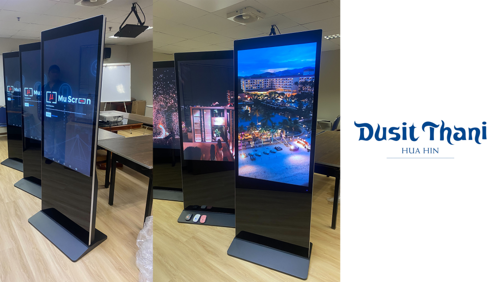 งานติดตั้งจอ Digital Signage Kiosk ขนาด 55 นิ้ว ที่โรงแรมดุสิตธานี หัวหิน จำนวน 3 จอ พร้อมซอฟต์แวร์ MuScreen สำหรับควบคุมสื่อโฆษณาผ่าน Cloud จำนวน 3 จอ ช่วยให้โรงแรมสามารถจัดการ Content บนหน้าจอได้ผ่านส่วนกลาง