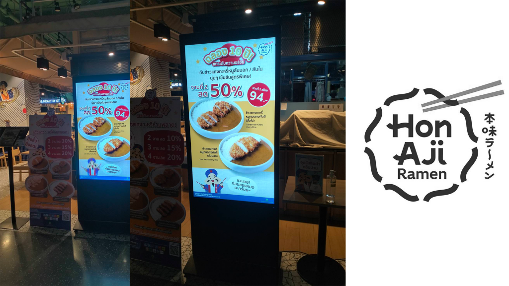 งานติดตั้งจอ Digital Signage Kiosk ขนาด 55 นิ้วแบบไม่สัมผัส งานเช่ารายปี ให้กับ HonAji Ramen สาขาพระราม 2 พร้อมซอฟต์แวร์ควบคุม MuScreen เพื่อช่วยให้แบรนด์สามารถควบคุมโฆษณาผ่านส่วนกลาง